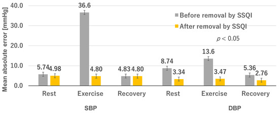 Motion artifacts during exercise affected the PPG measurement. The SSQI exhibited relatively high signal quality indices (SQIs). In particular, a higher rejection rate for high-error signals and a lower MAE were achieved. As such, daily BP monitoring requires considerable care when attaching a PPG sensor.