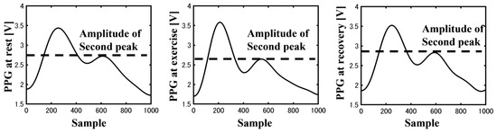 The second peak corresponded to the lower elasticity, which altered the pulse pressure and wall thickness. During exercise, the first peak corresponds to a large pulse pressure and thinner wall thickness, which bears a lower elasticity. As the second peak corresponds to the reflected wave, the second peak is typically lower owing to the lower elasticity (Figure 9). A typical example of a PPG waveform in three distinct phases is presented in Figure 9 to clearly illustrate the differences across the rest, exercise, and recovery phases.