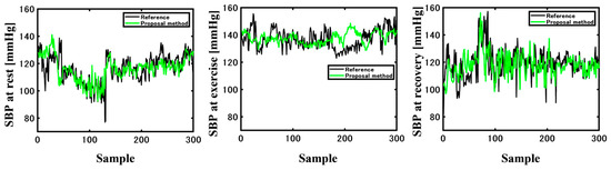 The Bland–Altman plot of SBP error indicated a systemic error. Although the range of the systolic BP was extremely narrow, the error between the reference and estimated BPs was linear. The time course of BP at three distinct epochs is depicted in Figure 10, during which the trend of the estimated systolic BP closely followed the reference BP at the rest and recovery phases. However, during exercise, the SBP did not progress appropriately due to the high rejection rate. As the LSTM algorithm is specialized on time series features, an exceedingly high rejection rate may induce large variations instead of slight fluctuations.