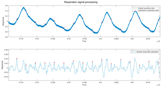 The number of data points determined from heart inter-beat interval time at the sample rate of 250 Hz is used to determine the frame length for a 3rd-order Savitzky–Golay filter. This filter effectively preserves high-frequency signal components and is popularly used for smoothing data. A 3rd order setting achieves the required results without adding unnecessary computational requirements. The output from this filter is subtracted from the band-passed signal and is presented in Figure 2. The upper panel shows the raw respiration signal and the lower panel shows the filtered heartbeat signal, respectively. This process sharpens the heartbeat R wave, elongating the peak without introducing other peaks at the height of respiration (which plagues the process if a longer frame length is used).