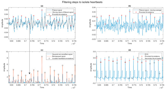 A process to increase the definition of the R waves is outlined next. First, a moving average filter with a frame length of 30 ms is used to find the average of the filtered signal, as shown in Figure 3a. The 30 ms time period is chosen as long as the T peak but longer than the R peak. When the averaged signal is subtracted from the filtered signal, the height of merged peaks is reduced, and the bulk of the oscillations in the elongated T wave are lowered, as shown in Figure 3b. The process distinguishes the desired R wave peak and removes low-frequency noise from the signal. Subsequently, the signal derived in Figure 3b is added to the mean of its absolute values in an array operation, moving the entire waveform into the positive domain. The resulting array is then squared and amplified to obtain the signal in Figure 3c, where the longer R peaks are easily distinguished from the surrounding data. This signal is passed through another bandpass filter, which passes frequencies from 0.5 Hz to 5 Hz, and all negative values are set to zero. This signal is used to locate the heartbeats using the MATLAB peak function algorithm. Finally, Figure 3d shows the found and annotated heartbeats with the participant’s ECG data for the same period.