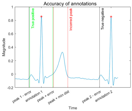 Any deviations between the found and the given annotations within 140 ms (35 data points at a sample rate of 250 Hz) are treated as true positives. False negatives are determined when a calculated notation did not occur within 140 ms of the supplied Fantasia annotations, as shown in Figure 4. Any other placement is defined as a false positive or a false negative. False negatives are also recorded if no peak was discovered between annotations at an offset of 140 ms before peaks. In contrast, an incorrect peak is designated if it is within a minimum distance of 0.32 s or 80 data points.
