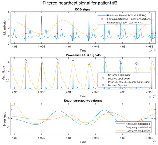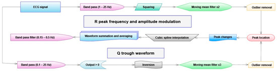 The ECG data is processed with a bandpass filter to exclude frequencies below one and above 25 Hz. The QRS is then squared once and averaged twice with a moving mean filter with a frame length of 75 data points. Then, MATLAB is used to locate peaks with a minimum peak distance of 160 data points and a minimum peak prominence of 0.5% of the maximum of the processed waveform. The resultant peak data are used to determine changes in height and distance, which reveals the amplitude modulation of the R peaks and the frequency modulation of the heart’s sinus rhythm. The Q waveform and the squared ECG signals are shown in Figure 6.