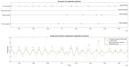 The detected peaks are then compared to those detected in the original respiratory data to assess the accuracy of determined peaks. This is accomplished by obtaining the average difference between expected inspiration peaks and reference peaks for the entire recording. The average mean distribution is determined using allocating bins of 0.2 s, and the entire composite waveform shifts to a maximum of 1.4 s. The inspiration peak locations are again assessed, using 50% of one average heartbeat period for true positive designations. Any designations outside this timing are recorded as a false negative. Peaks within 50–100% of one heartbeat are also labeled inaccurate peaks. The output is shown in Figure 7.