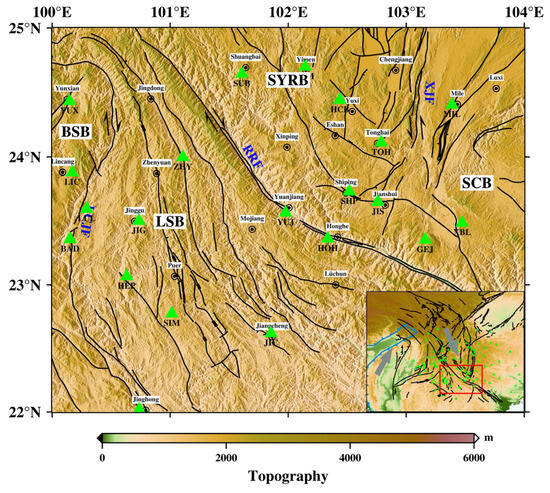 The tectonic background of southern Yunnan. The black lines denote the faults in the research area. LCJF: Lancangjiang (Lancang river) fault; RRF: Red River fault; XJF: Xiaojiang fault; SYRB: rhombic Sichuan–Yunnan block; LSB: Lamping–Simao block; BSB: Baoshan block; SCB: South China block. The green triangles are seismic stations used in the inversion. YUX: Yunxian; BAD: Bangdong; LUL: Luolian; HEP: Heping; JIG: Jinggu; LIC: Lincang; MEL: Menglian; SIM: Simao; ZHY: Zhenyuan; JIC: Jiangcheng; YUJ: Yuanjiang; HOH: Honghe; SUB: Shuangbai; SHP: Shipping; JIS: Jianshui; GEJ: Gejiu; XBL: Xibeile; MIL: Mile; HCB: Huangcaoba; YIM: Yimen; TOH: Tonghai. The inset denotes the location of the research area. The gray arrows represent the direction of plate motion. The blue line indicates the plate boundary. The red box indicates the study area.