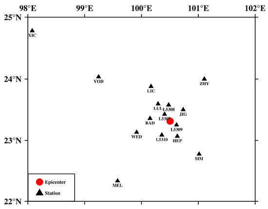 The focal mechanism solution is crucial for understanding the source information and stress field (e.g., [27]). The physical image of the P-wave first-motion symbol is clear and contains stable seismic wave information, which has a unique advantage in determining the focal mechanism solutions. In this paper, we collected 1639 ML ≥ 2.5 seismic events with P-wave first-motion data in southern Yunnan (22~25° N, 100~104° E) from January 2009 to June 2023. These data were from the official observation reports of the Yunnan region seismic network, and 123 stations were involved. In accordance with the limitations of seismic network stations in recording ML ≤ 3 earthquake events in the area of Southern Yunnan and the weak sensitivity to recognize the first-motions of P-waves, only ML ≥ 2.5 earthquakes with at least 15 symbols of the first-motions of P-waves were included in this research. We also provide an example of weak (ML = 2.5) earthquakes obtained at different distances from the epicenter being used to determine the focal mechanism (Figure 2). The ML = 2.5 earthquake of 10 December 2014, contains P-wave first-motion symbols recorded at 15 stations, with the furthest station (XIC) approximately 296 km and the closest station (L5309) approximately 13 km from the epicenter (Figure 2). Finally, a total of 15,211 P-wave first-motion polarity data points were obtained.