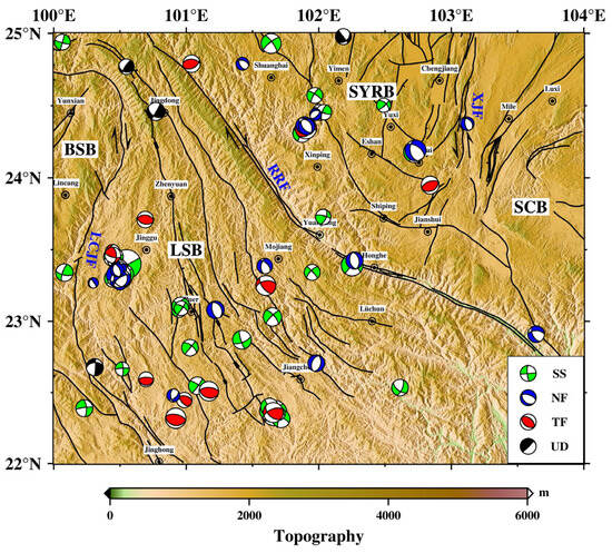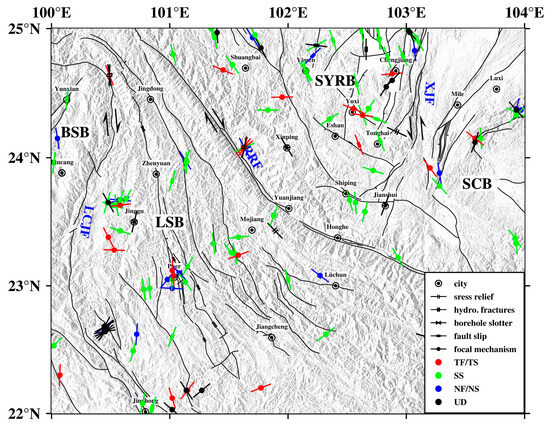 Various types of stress data are available in the study area. NF: normal fault; NS: predominantly normal with strike-slip components; SS: strike-slip; TF: thrust fault (reverse fault); TS: predominantly thrust with strike-slip components; UD: uncertain definition. SYRB: rhombic Sichuan–Yunnan block; LSB: Lamping–Simao block; BSB: Baoshan block; SCB: South China block; LCJF: Lancangjiang (Lancang river) fault; RRF: Red River fault; XJF: Xiaojiang fault.