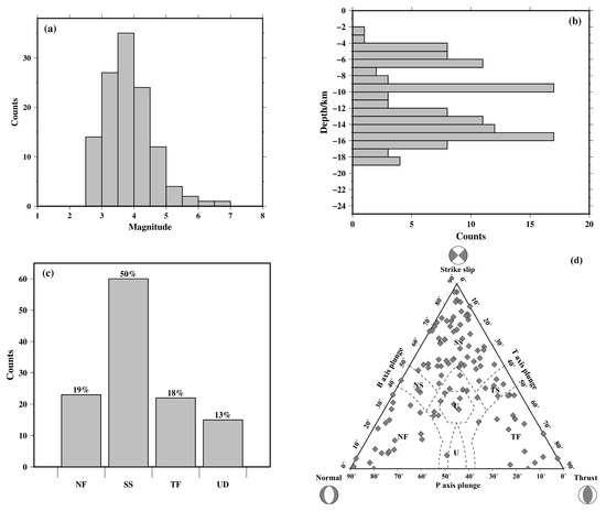 According to the calculation with the improved procedure of Yu et al. [29] for the grid point test method [28], the P-wave initial polarity data of a total of 120 seismic events satisfied the calculation conditions, and we obtained the focal mechanism of earthquakes (Figure 3). The magnitudes in these solutions varied from ML 2.5 to 6.9, with 88% of the earthquakes >ML 3 (Figure 4a). The depth distribution of focal mechanism solutions from the Yunnan region earthquake catalog (Figure 4b) shows that these seismic events mainly occurred at depths of 5–20 km, which reflects the stress state of the upper crust to a certain extent. Referring to the world standard for the classification of stress maps [34], the focal mechanism solutions were classified into six categories based on the magnitude of the plunge in the P, B, and T axes (Table 1), including normal fault (NF), normal strike-slip fault (NS), strike-slip fault (SS), thrust strike-slip fault (TS), thrust fault (TF), and uncertain definition (UD). Based on the classification criteria, the calculated data of the focal mechanism solutions were classified and grouped into statistics. In this paper, normal faults and normal strike-slip faults are collectively referred to as normal faults, and thrust strike-slip faults and thrust faults are collectively referred to as thrust faults (reverse faults). The statistical results show that southern Yunnan is mainly dominated by strike-slip fault earthquakes, with 60 strike-slip focal mechanism solutions, accounting for 50% of all focal mechanism solutions, 22 thrust faults and 23 normal faults, accounting for 18% and 19%, respectively, and 15 uncertain earthquakes, accounting for 13% of the total (Figure 4c). To visualize the proportions of thrust, normal, and strike-slip focal mechanism solutions among the earthquakes in our dataset, we adopted the ternary diagram introduced by Frohlich [35]. This diagram provides a quick and manageable way to determine the dominant style of faulting in a particular region. Figure 4d reports the distribution of focal mechanism solutions belonging to our final dataset in the diagram. The focal mechanism solution type in the study area is mainly the strike-slip type, which is consistent with the statistical results.