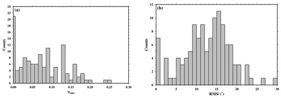 Quality evaluation of focal mechanism solutions. (a) Distribution histogram of the minimum weighted inconsistency ratio (ψmin). (b) Distribution histogram of the root mean square (RMS) of the minimum rotation angle.
