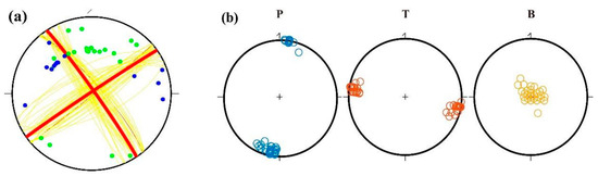 An example of a successful inversion is presented in Figure 6 for an ML 4.6 earthquake that occurred on 13 November 2015 (Figure 6). In Figure 6a, the 35 P-wave first-motion data points were evenly distributed on the focal sphere projection map, and cluster analysis showed that there was only one set of solutions. The discrete regions of the solutions of the three principal stress axes were also relatively concentrated (Figure 6b). For example, the minimum weighted inconsistency ratio (ψmin) was 0.05 (less than 0.15), and the root mean square (RMS) of the minimum rotation angle was 14.2°.