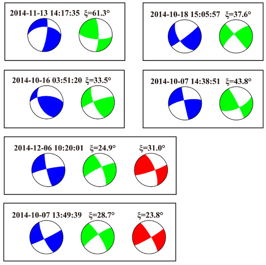 In general, our focal mechanism results are consistent with previous research results developed by other researchers. The comparison between the six focal mechanisms presented in this study and those in Xu et al. [37] or Globe CMT is shown in Figure 7. The range of the minimum 3D rotation angle between focal mechanisms, known as Kagan’s angle [38,39], is 23.8~61.3°. We attribute the larger rotation angle to a difference in data, computing method, and the uneven distribution of P-wave first-motion data points in some small earthquakes.