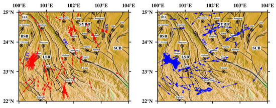 - Shen, Z.K.; Lü, J.N.; Wang, M.; Bürgmann, R. Contemporary crustal deformation around the southeast borderland of the Tibetan Plateau. J. Geophys. Res. 2005, 110, B11409. [Google Scholar] [CrossRef]
