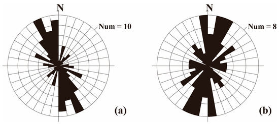 Statistical graph of the azimuth of the maximum principal stress from previous stress data in the study area. (a) Northeastern part of the study area. (b) Southwest part of the study area.