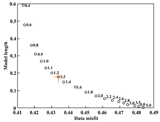 Graph depicting the relationship between the model length and data error. The red cross represents the optimal damping coefficient, and the number on the right of the hollow circle is the corresponding damping.