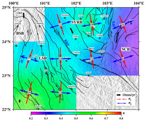 In terms of the distribution of the R-value of the stress shape factor, the R-value of the Lamping–Simao block generally increases from north to south, indicating that the intermediate principal stress is mainly manifested as the characteristics of tensile stress, and the relative proportion of compressive stress in the whole stress decreases. It can be inferred that the weakening of extrusion will make the movement velocity of the block gradually decrease from north to south. Gan et al. [53] found that the GPS horizontal velocity in the southeastern margin of the Tibetan Plateau showed a gradually decreasing trend from north to south, suggesting that the gradual slowing of underground material escape from north to south was consistent with GPS observations and manifested through the background tectonic stress field. The reason for the slow movement of the blocks in the study area may be that during the eastward escape of the Tibetan Plateau material, its eastward slip movement was blocked by the eastern South China block and forced it to deflect southward, and the speed decreased accordingly. Meanwhile, the Lamping–Simao block and the southern Baoshan block were far away from the strong compressive area of the East Himalaya structure, and the motion velocity and displacement of the block are smaller than those in the north, which is essentially consistent with the results of the block motion velocity calculated by Shen et al. [47] from GPS data. Their research also found that the rotation rate of the block also has a decreasing trend from north to south. In our study, the R-value distribution of the South China block is significantly smaller than that of the inner Sichuan–Yunnan block, indicating that the intermediate principal stress is mainly characterized by compressive stress, and the relative proportion of compressive stress in the whole stress increases, indicating that the compression action in this region is stronger, which may be related to the strong resistance of the rhombic Sichuan–Yunnan block to the east of the South China block.