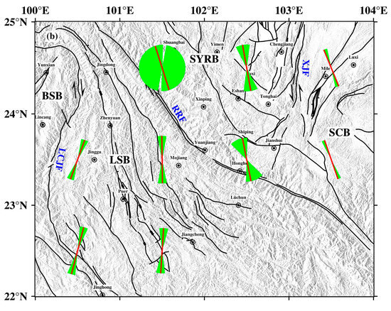 The southern Yunnan is located at the junction of the Eurasian plate and the Indian plate, which is not only affected by the extrusion force eastward in the main area of the Tibetan Plateau but also influenced by the deep subduction of the Burma arc, the wedging of the eastern Himalaya structure, and the self-gravitational collapse of various forces [48]. In addition, the southern Yunnan was blocked by the rigid blocks of the Sichuan Basin and South China in the east, causing a complex geodynamic environment and strong tectonic activity in this area [49]. These dynamic effects promoted the development of late Quaternary active faults, which divided the boundary of the study area into several blocks. The movement modes and speeds of different active blocks were different, and the differential movement between blocks was strongest at their boundary [50]. According to the distribution of the tectonic stress field (Figure 12), the variation in the direction of maximum principal stress also clearly verifies the differential characteristics of block motion. The rhombic Sichuan–Yunnan block is located on the channel where the material of the Qinghai-Tibet Plateau is prevented from escaping eastward and migrating southward. The inner part of the block exhibits overall NNW–SSE compression. Due to the obstruction of the South China block, the maximum principal stress in the southeastern boundary zone of the rhombic Sichuan–Yunnan block has a certain degree of clockwise rotation compared with the inner part of the block. The Lamping–Simao block is adjacent to the Burma arc plate subduction zone to the west, and the Indian plate is obviously subducted under the Burma arc mountains [51]. The NE migration of the Indian plate and the eastward extrusion of the Burma arc play a dominant role, and the maximum principal stress direction of the western region of the block is mainly the NNE–SSW direction. In the inner Lamping–Simao block, due to the proximity of the Sichuan–Yunnan rhomboid-shaped block and Baoshan block on the east and west sides, the direction of maximum principal stress is mainly near the NS direction under the joint action of the NE wedge of the East Himalayan tectonic junction and SE extrusion of the Qinghai–Tibet Plateau.