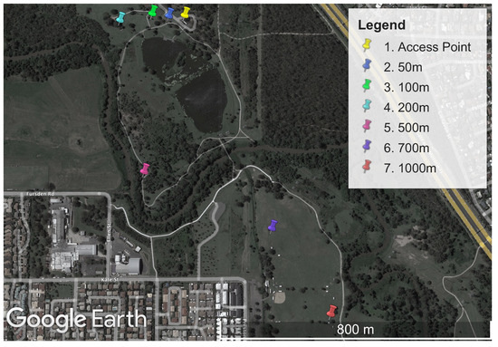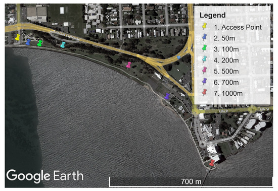 Map of Woody Point, located north of Brisbane, Australia, where the second validating performance experiments were conducted on Wi-Fi HaLow. Each measurement location is plotted as a distance from the stationary access point.