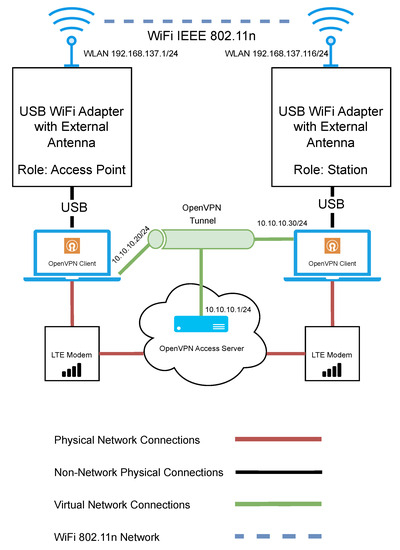 - 2 × Geecol Realtek 8812BU-based USB Wi-Fi adapters. These adapters are dual-band IEEE 802.11 ac. The adapter was set to IEEE 802.11 b/g/n mode, and the 5 GHz band was disabled. Testing of 5 GHz Wi-Fi was out of the scope of this study. External 2.4 GHz dipole antennas with a 2.8 dBi gain were attached to the adapters. The adapters’ transmission power was left at its default setting of 22 dBm.