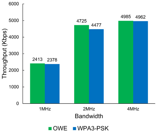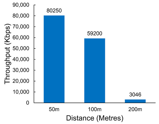 This work has examined Wi-Fi HaLow in a real-world setting. It is important to reinforce that one of this work’s technical contributions was to highlight the difference between real-world performance and theoretical performance. Table 5 shows the Wi-Fi HaLow 50 m throughput test results. These three tests were all executed with an MCS 7, which uses the 64-QAM modulation scheme. A significant difference is shown between the theoretical data rate and the actual measured performance. In particular, the 4 MHz bandwidth test could only reach 35% of the theoretical performance.