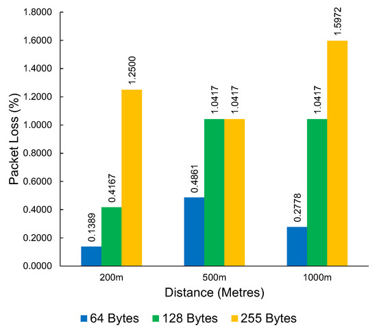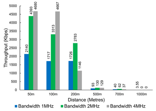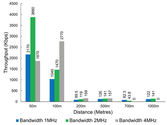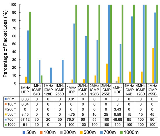 We observed a mixed result when looking at the ICMP vs. UDP packet loss results. The tests using iperf with UDP tend to send as many packets as possible in the given time. The ping packets sent via the ICMP protocol do not saturate the connection to the same degree as the UDP testing. At a bandwidth of 1 MHz, smaller, more infrequent transmissions, such as those generated using ping, seem to perform substantially better when compared with faster-paced UDP transmissions. The results are not as clear at other distances and bandwidths. For example, at a distance of 500 m, UDP performs more reliably than ICMP at a bandwidth of 2 MHz and 4 MHz.