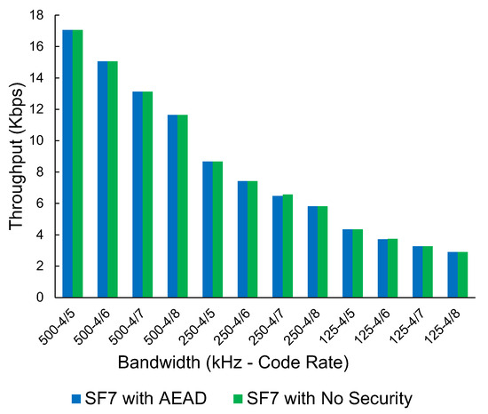 The network performance of LoRa can be customised by tuning a set of parameters to balance the needs of a given use case. These parameters can be altered to affect throughput, provide increased reliability, and improve the coverage range [20]. The main parameters that can be adjusted are Bandwidth (BW), Spreading Factor (SF), and Code Rate (CR). A lower spreading factor will provide faster throughput at the expense of maximum transmission range, with a higher bandwidth having the same effect [21,22]. Modifying the code rate can provide extra redundancy in the transmitted data to improve the resilience of the transmission while reducing throughput [21].