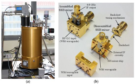 All of these components are installed on a hybrid cryostat (HDV10 from Infrared Laboratories) [36], or Dewar (see Figure 1b and Figure 2a), in which there are three cryogenic stages: two of them (i.e., 70 K and 20 K) are achieved thanks to a CTI model 350CP cold head [37] and the other (i.e., 4 K) is provided by a 10-inch-diameter high thermal conductivity plate in thermal contact with a vessel of liquid helium. The mixer, local oscillator coupler, circular horn, polarising grid, and optical lenses are mounted on the 4 K stage. The isolator and the LNA are mounted on the 20 K screen, connected to a stainless-steel inner and outer conductor coaxial cable. The SSB SIS receiver, including the SIS mixer, the IF LNA, the feed, and optics, deliver a low receiver noise temperature of less than 50 K when measured in front of the cryostat vacuum window.