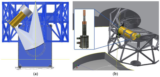 (a) Sketch of the tilting installation, where the Dewar is placed at an angle of 45 degrees from the zenith direction on the Gregorian receiver positioner (GRP). (b) Sketch of the horizontal installation with the new cryogenic cooler.