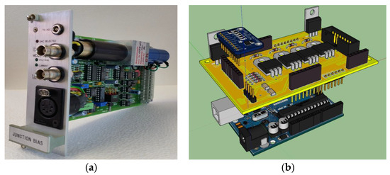 One side of the SIS junction is connected to a properly designed interconnecting bias circuitry that acts as an interface with the outside. This circuitry is implemented by IRAM in the so-called Junction Bias (JB) board (see Figure 6a), which permits both bringing out the IF signal and to providing bias driving in voltage or current modes [31]. This board, equipped with an internal reference voltage, provides the input junction voltage or current using a DC motor with a potentiometer or a digital-to-analogue converter (DAC), respectively. To evaluate the optimal biasing of the SIS junction, the board is fitted with two analogical outputs that trace the I/V characteristics. Unfortunately, the IRAM JB board has no on-board intelligence and is unsuitable for a receiver that is installed on the SRT. For these reasons, a new electronic control board has been developed for the purpose of managing the IRAM JB board (see Figure 6b), remotely. The new control board is equipped with a power supply stage designed to provide different voltage supplies (i.e., 5 V for digital logic circuit and for the potentiometer calibration, ±15 V for operational amplifiers, and 12 V for motor–potentiometer), a readout interface, and a control stage of the potentiometer motor. The readout stage is based on a high-resolution analogue-to-digital converter (ADC), model ADS1115, fitted on Adafruit modules from Texas Instruments [44] that allows the reading of the voltage and current values about the junction biasing, the potentiometer motor position, and the DAC of the IRAM JB board. The control stage of the potentiometer motor enables the tuning of the potentiometer using digital controls to set a specific current or voltage value for the SIS mixer junction. Furthermore, this stage also permits the setting of supplies for both the motor–potentiometer configuration and the DAC configuration of the IRAM JB board.