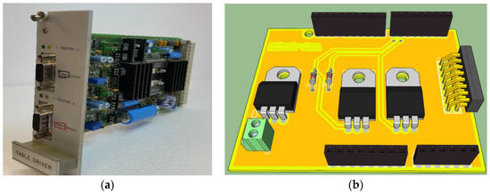 The control system for the management of the receiver calibration block requires switching from two available positions for the DC motor: calibration on and calibration off, respectively. These features are provided by the motor position with respect to two inductive proximity switches: the first for the rest position (i.e., calibration off) and the second one for the working position (i.e., calibration on). IRAM developed an electronic board for the execution of these operations (see Figure 9a) devoid of onboard intelligence, and the remote control is unavailable. Therefore, a new receiver calibration motors control board, equipped with a power supply stage and a motor control stage, was developed (see Figure 9b). The motor control stage permits moving the DC motor between the two working positions (i.e., calibration on and calibration off positions) and collecting information about its state.