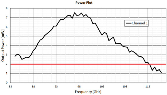 Figure 11 shows the plot of the output power of the local oscillator (channel 1). The drain and gate voltage values are set at 1.67 V and −0.1 V, respectively. The curve shows a peak power of approximately 7 mW at 98 GHz. The minimum value of 2 mW (highlighted in red) is exceeded in almost all local oscillator bandwidths from 85.75 to 114.25 GHz. These requirements can be easily achieved by optimising the drain and gate voltages.