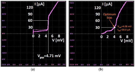 After the evaluation of the output power levels of the local oscillator, the I-V characteristic of the SIS junction of the two-junction array mixer is measured [47]. The measurement is carried out by connecting the digital oscilloscope to the SIS mixer junction bias module of the control system. In Figure 12, the measurement results are shown. In particular, the curve of Figure 12a shows the I-V characteristic of the mixer without the local oscillator power applied, where a spurious Josephson current is present (unsuppressed, as the mixer does not have a magnetic circuit), whereas the curve of Figure 12b represents the case with the local oscillator biasing at 87.5 GHz.