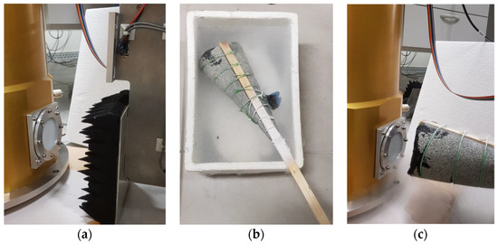 (a) Room temperature load placed in front of the HDPE system and the feed of the receiver. (b) Absorbing panel immersed in a container filled with liquid nitrogen. (c) Cold load placed in front of the HDPE system and the feed of the receiver.