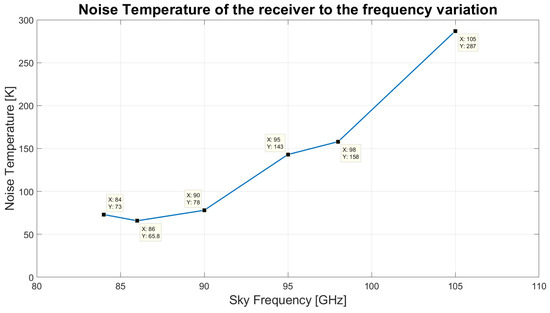 Table 2 summarises the results of the experiment in the frequency range between 84 and 115 GHz. The measured receiver noise temperature varies considerably as a function of the LO frequency, as shown in the plot of Figure 14. The noise has a minimum of approximately 66 K around 86 GHz RF and increases to approximately 290 K at 105 GHz RF. The measured noise is considerably higher than the one delivered by the original PdBI receiver (where noise of order Trec ≈ 30 K was reported), which was based on a third cryogenic stage cryogenically cooled by liquid helium at 4.2 K, allowing the thermal cooling of the SIS mixer to less than half of the critical temperature of the niobium superconductor (with Tc ≈ 9.2 K). The discrepancy between the receiver noise temperatures measured by IRAM in the original receiver configuration and the one measured at INAF with the modified receiver are mainly due to the different physical temperatures achieved for the third stage (4 K stage), where the mixer is thermalised. The receiver noise is expected to degrade considerably if the physical temperature of the SIS mixer is increased beyond ≈4.5 K. A cryogenic temperature of approximately 6.6 K (much greater than the required ≈4 K value) was achieved during the laboratory tests, in part due to the limited thermal cooling power delivered by the ARS cold head, and in part due to the non-optimal thermal isolation of the coldest cryogenic stage, which requires improvement. This aspect caused a degradation of the receiver noise performance. However, the noise temperature results achieved in the frequency bandwidth 84–95 GHz are considered in line with the initial goals of this project, which aimed at testing the capabilities of the SRT in the 3 mm frequency range. The receiver, if installed on the SRT, could also be suitable to conduct millimetre VLBI experiments at 86 GHz [50].