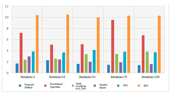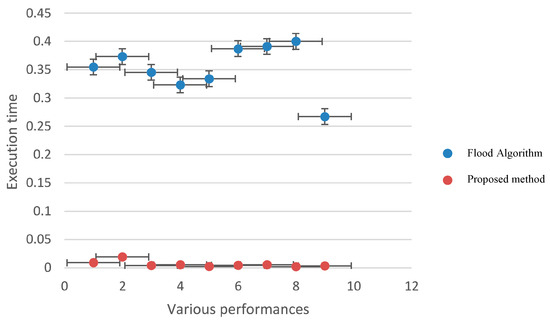 To further assess the performance of the suggested algorithm, we conducted a comprehensive comparison of its execution time with the flood algorithm. In order to obtain accurate results, we ran each program multiple times and measured the run time in different scenarios. The execution times of both algorithms were recorded, and the results are presented in Figure 15 below. The figure illustrates the comparison of the average execution times of the suggested algorithm and the flood algorithm. It provides a visual representation of the efficiency of both approaches in terms of run time.