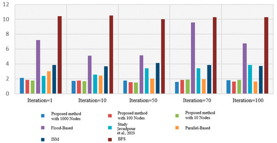 To evaluate the scalability of the proposed method, we conducted simulations for different network sizes, ranging from 10 nodes to 1000 nodes. The results of these simulations are presented in Figure 13 below. The figure compares the number of steps taken by the suggested technique with other approaches, including the flood algorithm, study [16], parallel diffusion algorithm, and the ISM method. Upon analyzing Figure 13, several key observations can be made. For a small number of nodes (e.g., 10 nodes), the suggested technique exhibits a relatively higher number of steps compared to other approaches, such as flood and the study [16]. As the number of nodes increases (e.g., 100 nodes and 1000 nodes), the number of steps taken by the suggested technique decreases significantly and converges with the number of steps taken by other approaches.