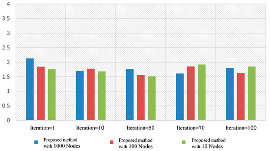 To provide a more comprehensive analysis of the suggested method’s scalability, Figure 14 below presents a separate comparison of the number of steps performed by the proposed technique for each network size. The figure illustrates the efficiency of the suggested method in terms of the number of steps taken for 10 nodes, 100 nodes, and 1000 nodes separately. It shows how the number of steps decreases as the network size increases, demonstrating the scalability of the proposed algorithm. The evaluation of scalability through simulations reveals that the suggested technique adapts well to different network sizes, showcasing good scalability characteristics. While the number of steps may be slightly higher for smaller networks, it quickly converges as the network size increases. This demonstrates the efficiency and effectiveness of the proposed method in handling large-scale distributed collaborative applications. The analysis further supports the suitability of the suggested technique for peer-to-peer systems with varying numbers of nodes, making it a robust choice for real-world scenarios with dynamic and changing network environments.