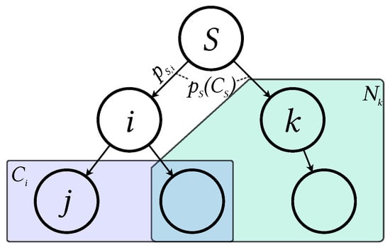 In a broadcast tree, each node has exactly one parent i, whereas each parent may have multiple children. The set of children of a parent i is denoted as , as indicated by the blue box in Figure 1. Further, we assume that all communication links are bi-directional. Due to the broadcast property of wireless communications, a parent node i has to send data only once, while all its children should be able to receive it.