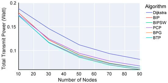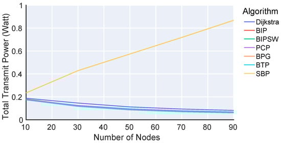 Table 2 shows the parameters of our Matlab simulation. The nodes are randomly placed in a 500 m × 500 m square area, which allows us to assess BTP under various conditions while not taking advantage of an optimized node placement strategy in order to reflect practical constraints. Still, we require each node to have at least one neighbor according to Equation (5), while the maximum transmission power of a node is set to dBm. Further, the number of nodes varies between 10 and 90. The source node is chosen randomly for each simulation run. The channel is based on a path-loss model for which , where d is the distance between the nodes i and j and is the attenuation exponent, which is set to . The SNR must exceed 10 dB for correct reception, while the noise power is set to −90 dBm. The finishing threshold is set to 10 unchanged iterations (see Section 4.2.1) since the broadcast tree did not improve further with a larger threshold in trial experiments. For each parameter combination, 1000 simulation runs were executed, i.e., a total of 63,000 simulations runs. We implemented the following algorithms for comparison with BTP:
