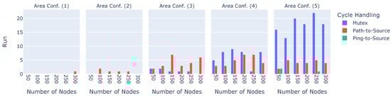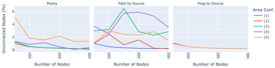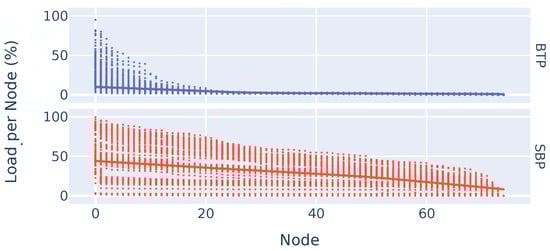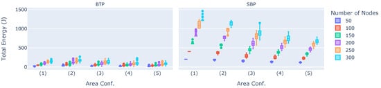 The x-axis arranges nodes according to their loads (not their topological relationships) in relation to the total energy consumed over the entire experiment. This means that, for example, node 1 is not next to node 2, but node 1 contributes more to the total amount of energy required than node 2. The y-axis shows how much an individual node contributes to the amount of energy required, e.g., a dot at 50% at 0 means that node 0 contributes 50% of the required energy. The sub-plots and colors represent the two protocols with all experimental configurations. Using BTP, only a few nodes had a relatively high level of energy usage, while the nodes beyond node 20 barely contributed to the overall level of energy consumption. In SBP, on the other hand, all nodes contributed to overall energy utilization. This shows that although there are nodes in BTP that have a high load, the energy for most nodes is preserved, giving them a higher lifetime when battery-powered. Note that Figure 13 is a scatter plot covering all experimental runs; thus, it is not easy to see which values sum to 100%. There were experiments where, taking SBP as an example, a single node was responsible for 100% of the energy consumed. In this specific experiment, no other node sent any data, indicating that one node in the neighborhood of the source node received the data. This was the case for the unfinished experiments with a 1 KiB data size and a finishing threshold of 5, as indicated in Figure 11.