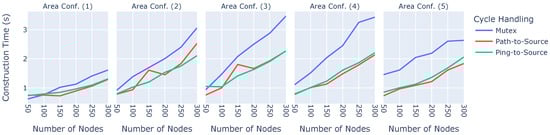 When node j decides to choose node i as its new parent, it sends a Child Request packet to i in order to become its child. Node i verifies that j is not i’s parent, j is not already a child of i, and j is reachable from i, i.e., . If all these checks are successful, i accepts j as a child using a Child Confirmation packet or rejects it otherwise using a Child Rejection packet. When i accepts j, it adjusts its transmission power to , resulting in an increase if is greater than ; otherwise, the value stays the same as before. Even if i must increase its transmission power, the total transmission power p is still lower because j only connects to i if the condition of Equation (13) holds. When i accepts j as its child, j disconnects from its old parent using a Child Revocation packet. , in turn, removes j from its child list and adjusts its transmission power accordingly to reach the farthest child . However, when i rejects j, j places i on a blocklist to avoid repetitive connection attempts and repeats the above processes to find a new parent.