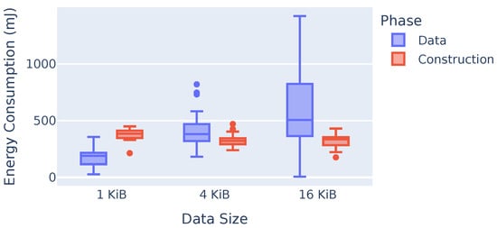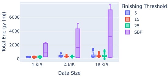 Figure 10 presents the energy required for broadcast tree construction and for data dissemination. The x-axis shows different data sizes, while the y-axis shows the energy used for Application Data packets (blue) and for the tree construction packets (red) for BTP and all the finishing thresholds. The energy required for tree construction does not depend on the size of the data but only on the number of nodes; thus, the red plots do not show significant differences. The energy required for data dissemination increases with the size of the data. For the 1 KiB data, about 30% of the energy is used for data dissemination, and about 70% is used for tree construction. However, even in this scenario, BTP performs significantly better than SBP in terms of total energy consumption, as shown in Figure 9. BTP requires about 1.5 MiB of data to construct a tree, regardless of the finishing threshold or data size, whereas data dissemination requires about 150 MiB of total data transfer for 1 KiB experiments, 300 MiB for 4 KiB experiments, and about 400 MiB for 16 KiB experiments. Note that there are outliers in experiments, since the environment can vary under real conditions. For example, in the 4 KiB experiments, three runs required between 740 mJ and 800 mJ of energy, which is outside the 1.5-fold interquartile range.
