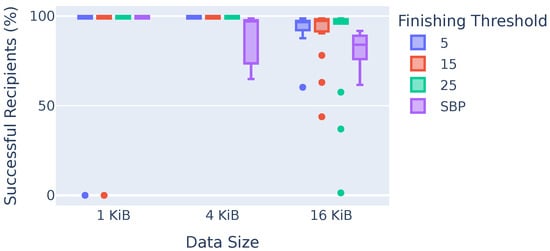 Figure 11 shows the results in terms of successful deliveries. The x-axis shows experiments with different data sizes, while the y-axis shows the percentage of nodes that received the entire dataset. The colors denote different finishing thresholds and SBP, respectively. BTP produces results that are at least on par with SBP; with larger data, SBP’s performance becomes even worse. For 1 KiB and 4 KiB data sizes, BTP achieves a nearly 100% delivery ratio, with a few runs producing outliers. SBP only achieves this success ratio for 1 KiB, while for 4 KiB and 16 KiB data sizes, the average delivery rate falls below 85%. For a data size of 16 KiB, BTP still achieves an average delivery ratio of about 98%. This result (and the failed runs for 1 KiB and 4 KiB data sizes) is mainly due to the varying conditions of the network and the wireless medium. Even though the tests were conducted in a testbed, there were no lab conditions. The testbed was deployed in a building in the university, where there are offices and lecture rooms with employees and students and a number of other Wi-Fi networks; thus, some of the experiments were not completed. The poor performance of SBP, however, is due to the fact that BTP makes better use of the wireless medium by refraining from flooding the network with maximum transmission power, thus producing less interference between stations. Note that there are outliers in experiments, since the environment can vary under real conditions. For example, in the 1 KiB and 16 KiB experiments, there are runs that have no successful receptions at all, which is outside of the 1.5-fold interquartile range.
