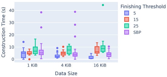 Figure 12 shows the time taken to construct the broadcast tree. The x-axis shows the different data sizes, while the y-axis shows the construction time in seconds. The different colors represent different finishing thresholds. This figure has three key takeaways. First, the size of the data does not influence the time it takes to construct the broadcast tree. Second, the higher the finishing threshold, the longer it takes to construct the tree, which is the expected result. Third, the average time of seven seconds for the initial construction of the broadcast tree, which is only performed once, is reasonable since the constructed broadcast tree can subsequently be used for an arbitrarily long time period. Note that there are outliers in experiments, since the environment can vary under real conditions. For example, in the 1 KiB SBP experiments, there are runs that take up to 40 s to construct the tree, which is outside of the 1.5-fold interquartile range.
