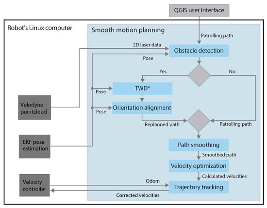 The velocity controller calculates odometric characteristics by transforming the measured velocities of wheels into transnational and rotational velocity in the local robot frame, and vice versa. The extended Kalman filter (EKF) fuses the IMU and GPS data with the odometric data and yields the robot’s position and orientation in the global map frame. Two-dimensional laser range data are extracted from Velodyne point cloud data in order to ensure obstacles can be avoided during the execution of the smooth motion.