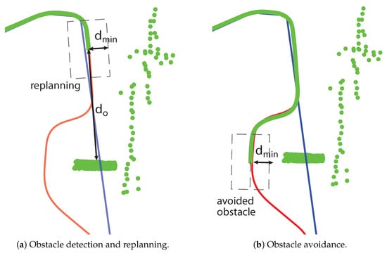 If the obstacle is not detected in the vicinity of the starting position, determine whether the smooth path is collision-free. At every point , compute the smooth path distance to obstacles in the global map frame. If the distance is less than the minimum allowed, i.e., if it is less than , which is the width of the robot’s footprint, or if the robot’s current position is less than , that is, the robot’s distance from obstacles in the global map frame, then the robot is on a collision course with an obstacle on the smooth patrolling path (see Figure 4). Calculate the replanned path only if the obstacle is on the current path segment, i.e., between two consecutive goal points (see Algorithm 1, lines 10 and 13).