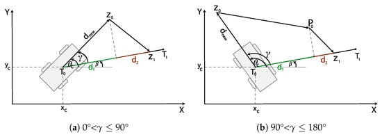 First, laser readings are transformed from the local robot frame into the global map frame (see Algorithm 1, lines 3 and 4). Then, the vicinity of the starting position is checked. If an obstacle is detected in the vicinity of the starting position, i.e., if the distance from the robot to obstacles is less than the predefined , which is the minimum allowed collision-free distance, and it is equal to double the diameter of the circumscribed circle around the robot’s footprint, the algorithm selects the goal behind the robot, so the robot needs to move backward first. This goal is determined on the prolonged path segment behind the robot with a distance of from the obstacle as shown in Algorithm 1, lines 6–8.