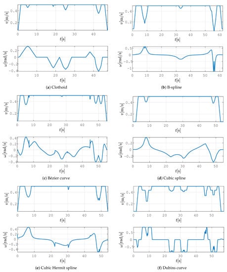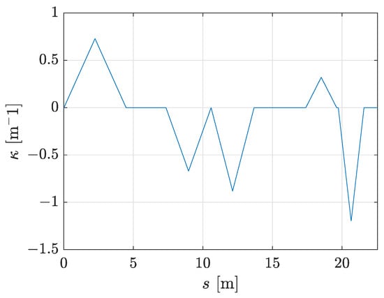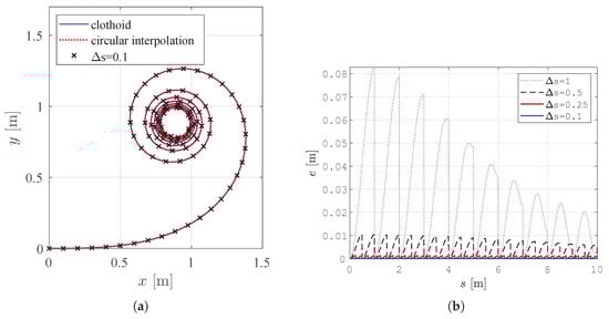 Some methods that produce a smoothed path use simple shapes such as circles, arcs, and lines [20,21]. The presence of discontinuities at the intersections of straight lines and circular arcs makes these methods infeasible for real applications. A similar case applies for a cubic Hermite spline, which only has continuity of tangency [22]. Other methods based on, e.g., spirals, splines [23], and Bézier functions [24], have difficulty controlling curvature. This problem can be avoided by employing cubic splines [25] or clothoids. A parametric expression of a clothoid’s coordinates contains Fresnel integrals [26], which are transcendental functions that cannot be solved analytically, making them difficult to use in real-time applications. However, the very effective and computationally least-demanding way of calculating clothoids, and also the most suitable solution for real-time applications, is the method presented in [27]. So-called basic clothoid coordinates are stored in a lookup table, and the coordinates of any other clothoids (i.e., a general clothoid) are easily determined based on the stored basic clothoid coordinates via rescaling, rotating, and translating.