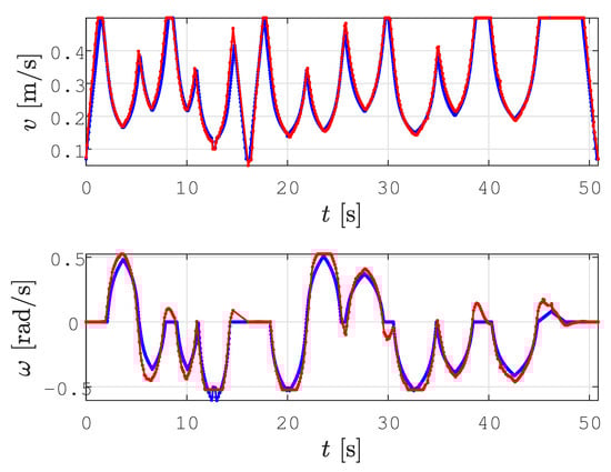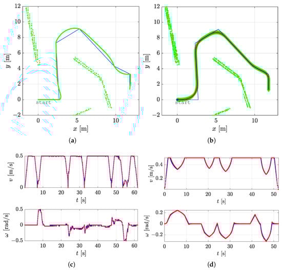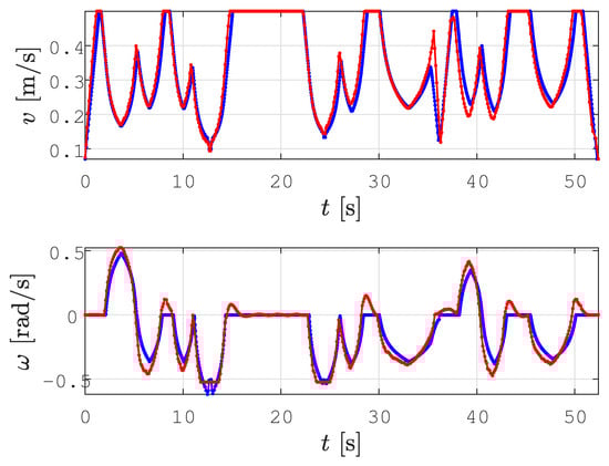 The velocity profiles for the smooth motion planning with dynamic obstacle avoidance scenario are shown in Figure 20. When the dynamic obstacle is detected on the smoothed path, the replanning algorithm is executed, and the robot slows down before continuing to drive along the replanned path. This is shown at around 35 s, where the reference (blue line) and actual (red line) linear velocities drop to m/s. Afterward, new linear and angular velocity profiles are calculated for the replanned path. The results show that the robot can track the trajectory and successfully avoid collisions with continuous motion (i.e., without stopping).