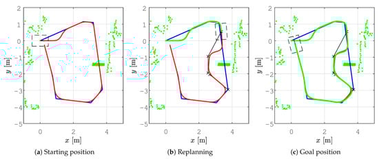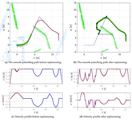 In all the figures below, the real obstacles are extracted 2D laser range data from the Velodyne point cloud data and are presented as green dots, while the patrolling path is denoted by a blue line, the smooth patrolling path is denoted by a red line, and the tracked trajectory from the start to the goal is denoted by a green line. The TWD* algorithm was used for obstacle avoidance, and the replanned TWD* path is represented by a black line. The start, replanning, and goal positions of the robots are marked with the robot’s footprint as dashed lines.
