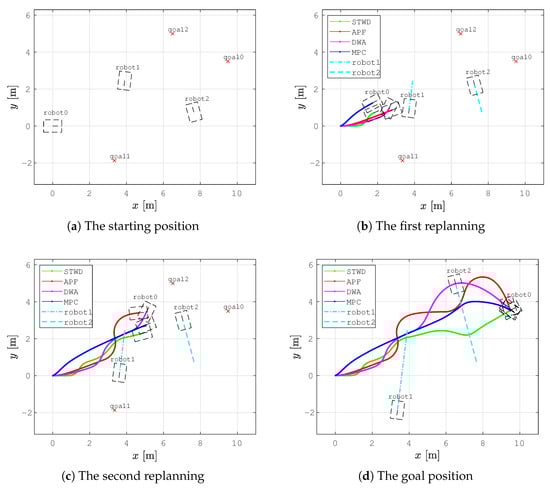 The step-by-step local path-planning scheme in a dynamic environment presenting the travel trajectories of robot1 and robot2 (cyan dashed lines) toward goal1 and goal2, respectively: the STWD* (green line), APF (red line), DWA (magenta line), and MPC (blue line) travel trajectories of robot0 from start to goal0.